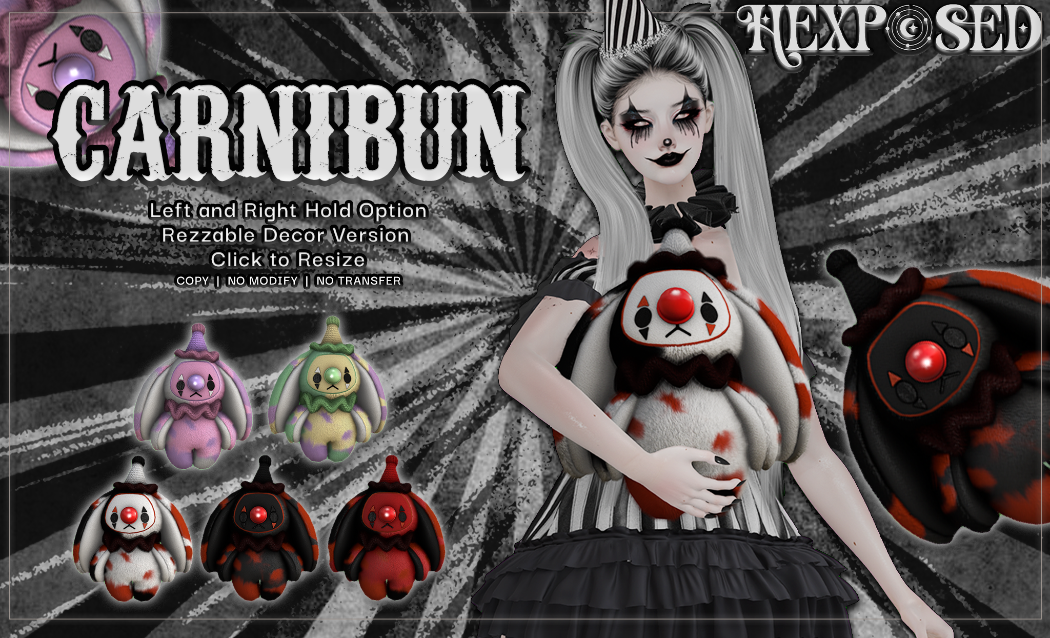 Her Umbra Skin and addons by Loa give her that otherworldly glow, as though she doesn’t entirely belong to the world beneath the carnival lights. YOSHI’s Viktor Eyes hold a distant story. Simply Shelby’s Cirque des Rêves set frames the scene with storybook charm. And beside her rests HexPosed’s Carnibun in Pink, equal parts adorable and slightly tragic, like every forgotten prize at closing time.