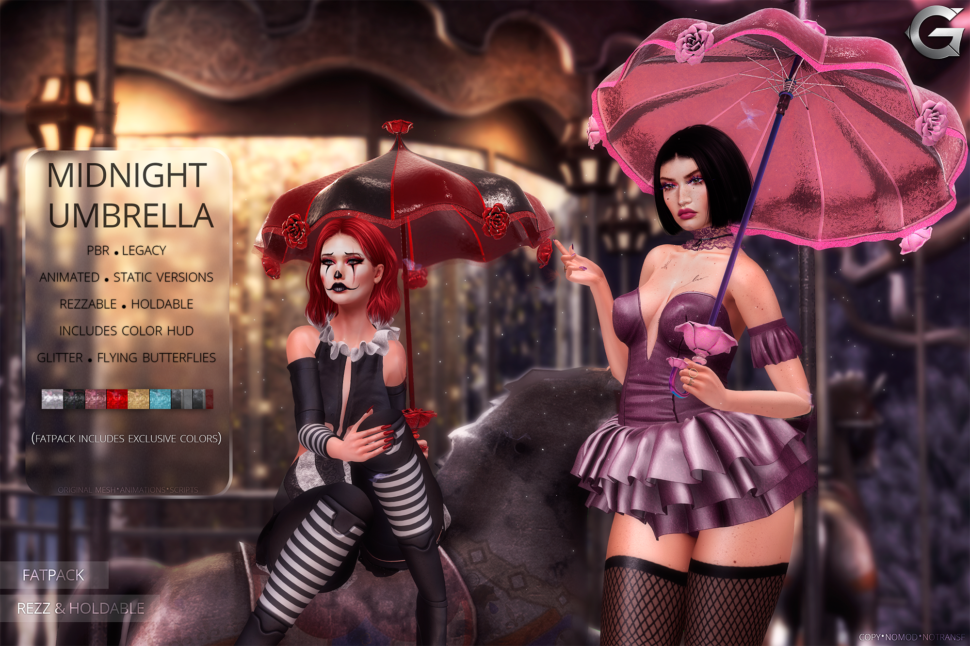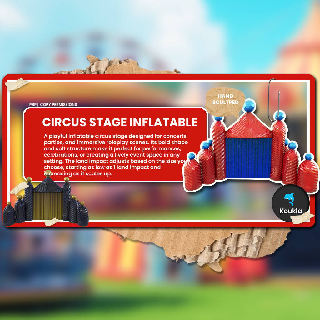 Set against the bold, inflatable circus stage from Koukla, the scene glows with saturated reds and blues that feel almost too cheerful. The clown figure, styled with the striking male clown design from Fallen Gods Inc., stands confidently beneath the lights, paint smeared and smile distorted, blurring the line between performance and threat. Intricate tattoos by Scaletta Studios crawl across his skin like whispered symbols, while the scattered catching cube from Geek adds a playful prop that feels less like a toy and more like a test.