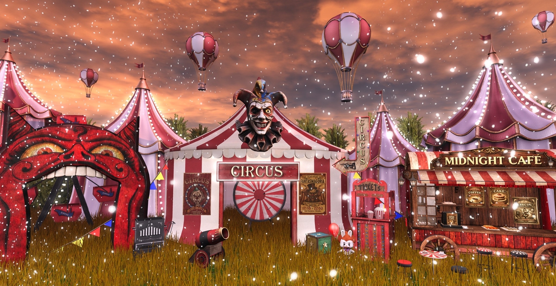 At the heart of the scene, the magnificent Vintage Circus Collection by ::InkMe:: rises in bold crimson stripes, crowned by strings of carnival lights and a grinning facade that feels both theatrical and slightly unhinged. The entrance drum gleams beneath the word CIRCUS, promising marvels just beyond its doors.